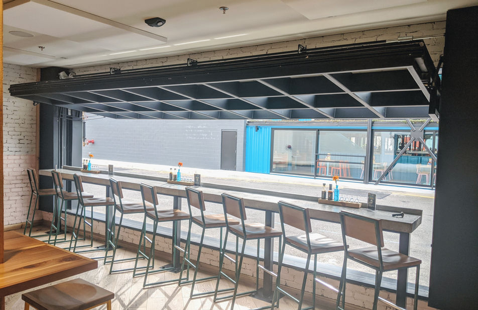 Casa Del Barco is yet another restaurant where Renlita was the perfect addition. A single-panel S-1000 door installed at the Chesterfield Towne Center in Richmond, VA opens up uniquely right next to static seating while not interfering with the large bar style table. The massive door allows for added small party seating to turn into al fresco dining and the flexible space becomes a crowd favorite. They're not the only Renlita on the block though, as their neighbors also took the hint from the increased business and designed their own rooftop area with multiple Renlita's, but this isn't about them! Casa Del Barco is a top-shelf Mexican eatery with a cool and vibrant clientele who love their margaritas, street tacos, and tapas in an artsy vibe. Come see why more and more restaurants are designing their spaces with architectural openings like Renlita's S-1000 Floataway!