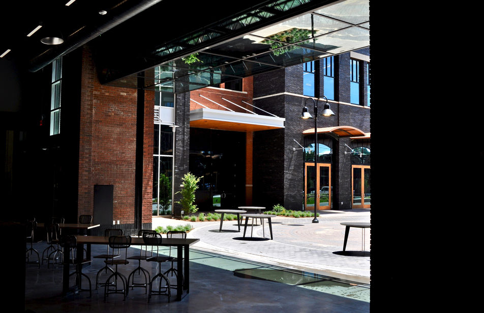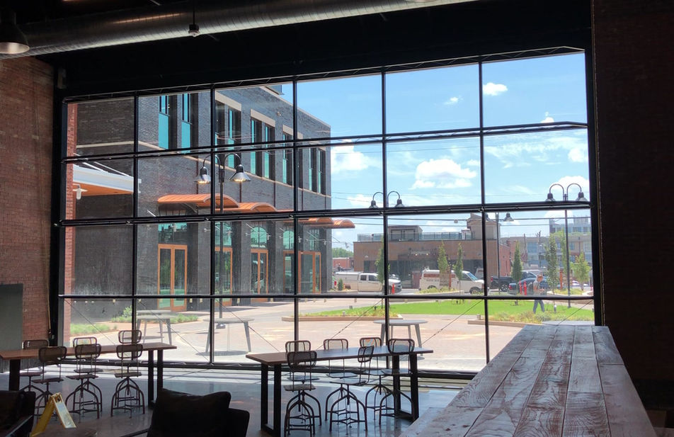 The Railyard installed a massive S-3000 Foldaway door that opens into the adjacent courtyard. It provides the ability to let in natural light and block solar UV rays using insulated low-e glass while opening up to the outdoors in beautiful weather. One of several Renlita bifold doors in the historic South End of Charlotte, NC, the Railyard sits in the heart of the area and includes retail, restaurant, and office space near shopping, parking, and lots of fun activities. The large bifold door is an architectural focal point for the entire community and offers a stylish look and effortless operation not found in typical hydraulic doors or other hangar door-style openings. Extra safety measures such as inertia brakes ensure no troubles with even the largest doors, and the interlocking truss systems and balanced approach make this S-3000 open completely with very little lost space. You can't do that with a hydraulic bifold door!